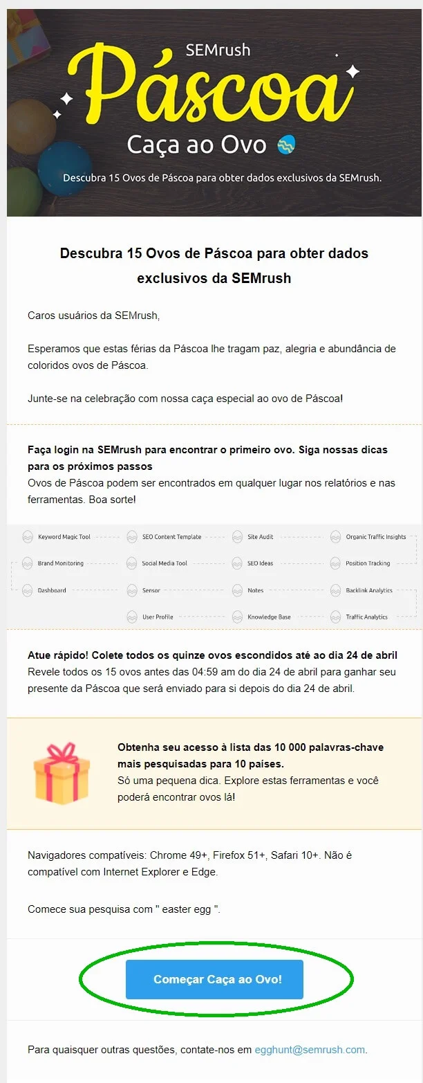 - Concurso de caça aos ovos (como no exemplo do SEMrush): um e-mail convidando os destinatários a participarem de um concurso de caça aos ovos online, com prêmios e descontos exclusivos para os participantes.