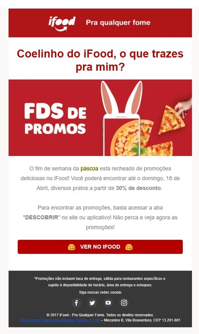 - Oferta de Páscoa para famílias: e-mail com uma oferta especial de Páscoa voltada para famílias, incluindo descontos em produtos para crianças e atividades divertidas para a celebração em casa.