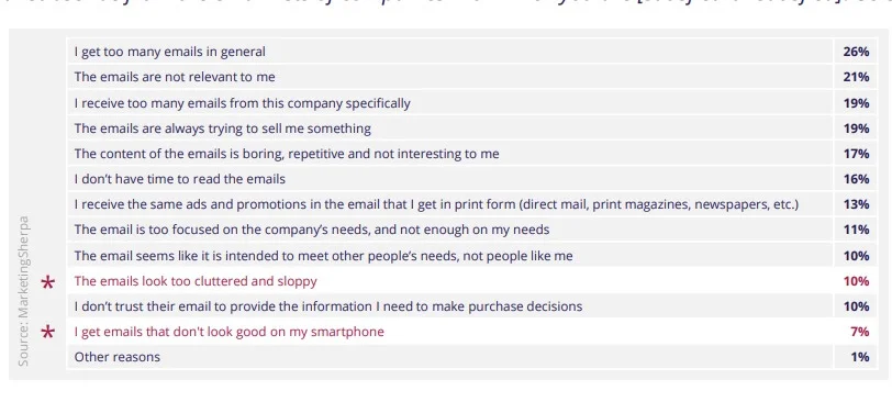 Adivinhe qual o principal motivo para o cancelamento de inscrição no recebimento de e-mails dos usuários? A pesquisa do Instituto especializado em marketing dos Estados Unidos, MarketingSherpa, deixa claro, assim como outras pesquisas feitas no mercado.