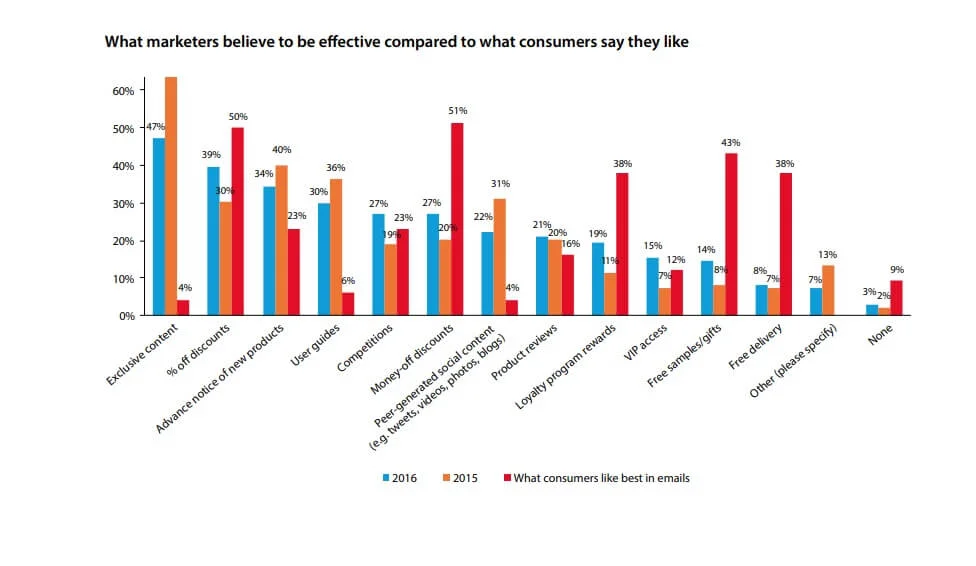 O gráfico compara, em porcentagens, o que os clientes e profissionais do marketing acreditam ser eficaz em envios de e-mail. Observe as diferenças, bem grandes em alguns pontos, como conteúdo exclusivo e presentes (gifts) e atue nelas para melhorar o desempenho dos seus envios.