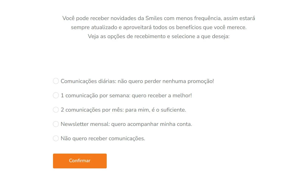 Nessa imagem, a empresa deixa o cliente escolher a frequência de marketing desejada, inclusive não receber. Você pode colocar essa opção nos primeiros e-mails de uma campanha ou também colocar essa questão em pesquisas recorrentes do seu negócio.