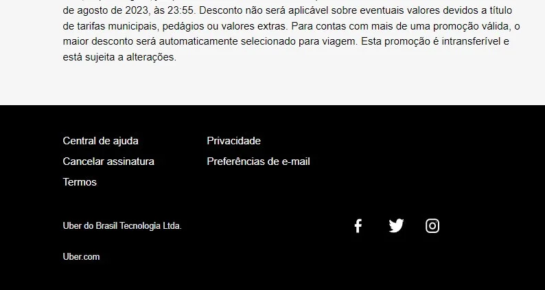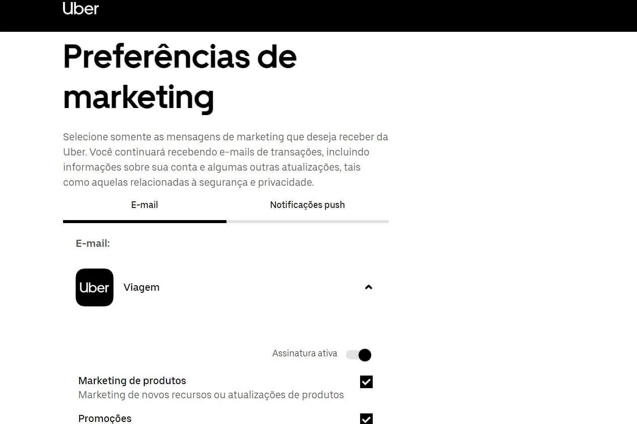 Esse e-mail da Uber é quase o exemplo perfeito. A empresa permite que você cancele facilmente o recebimento do marketing de e-mails e ainda escolha qual tipo de mensagem quer ou não receber. Veja a próxima imagem.