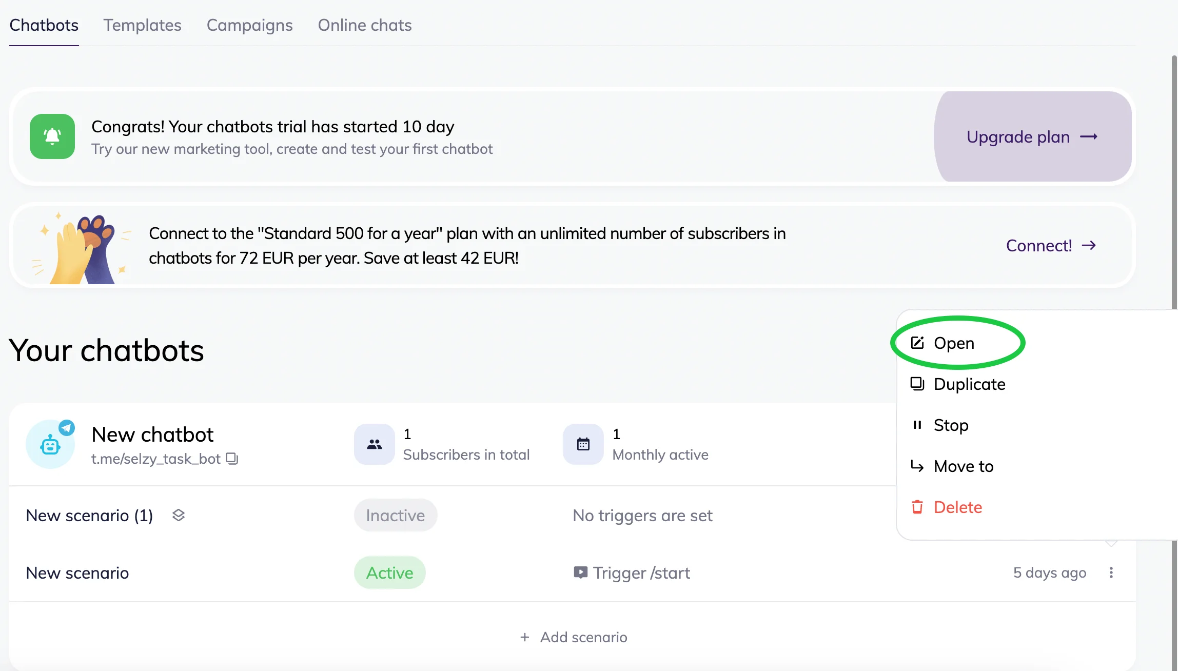 If you built your bot with Selzy, you’ll be able to see the number of interactions and clicks for each separate block that you’ve added to your conversational flow. To do that, go to the Chatbots dashboard, find your bot, and click on Open.