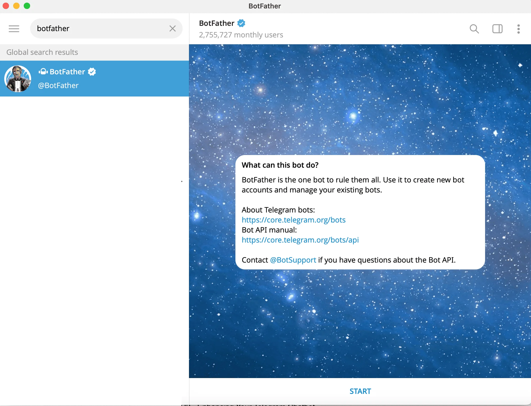 Once your account is ready, search for a bot called BotFather, which is Telegram’s official tool for creating your own bots.