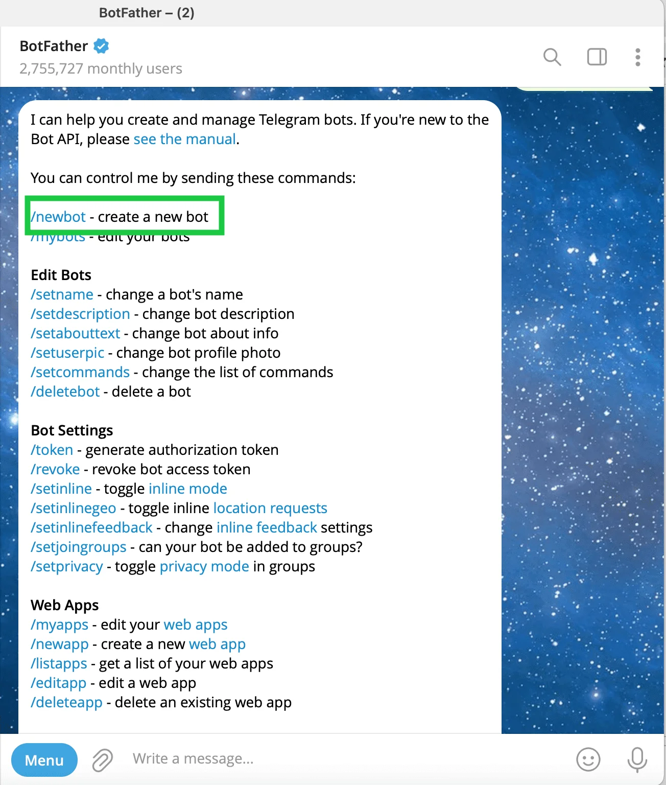 In the dialogue with BotFather, click on the Start button. You’ll see a menu of all commands available. Since we’re just getting started, select /newbot.