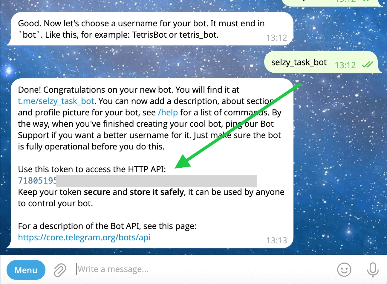 Create a bot in BotFather. Type /newbot, set Name and Username (must end with bot), copy the API token.