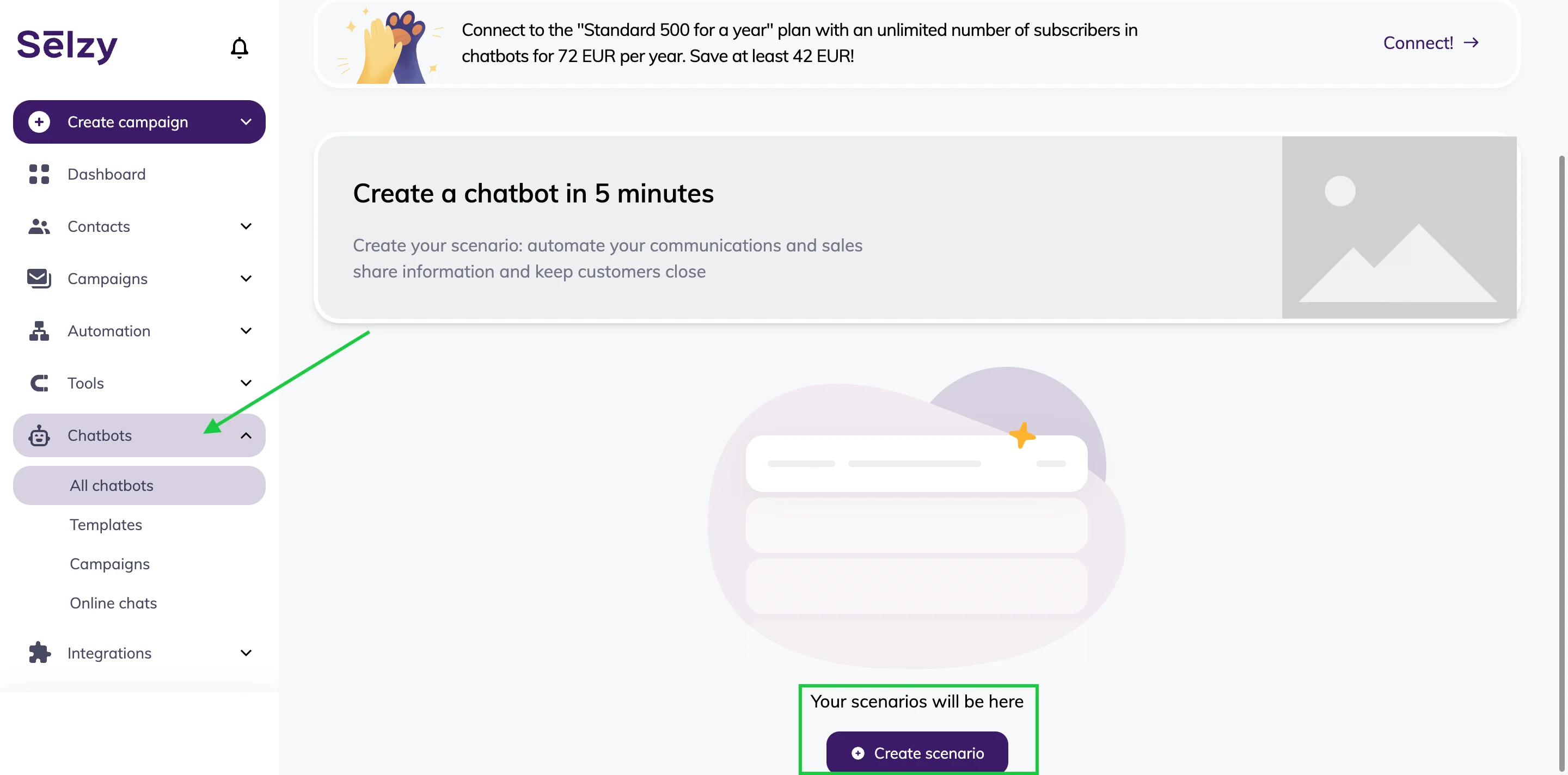 Once you’ve logged in to your Selzy account, click on Chatbots and scroll down to Create scenario button on the right.