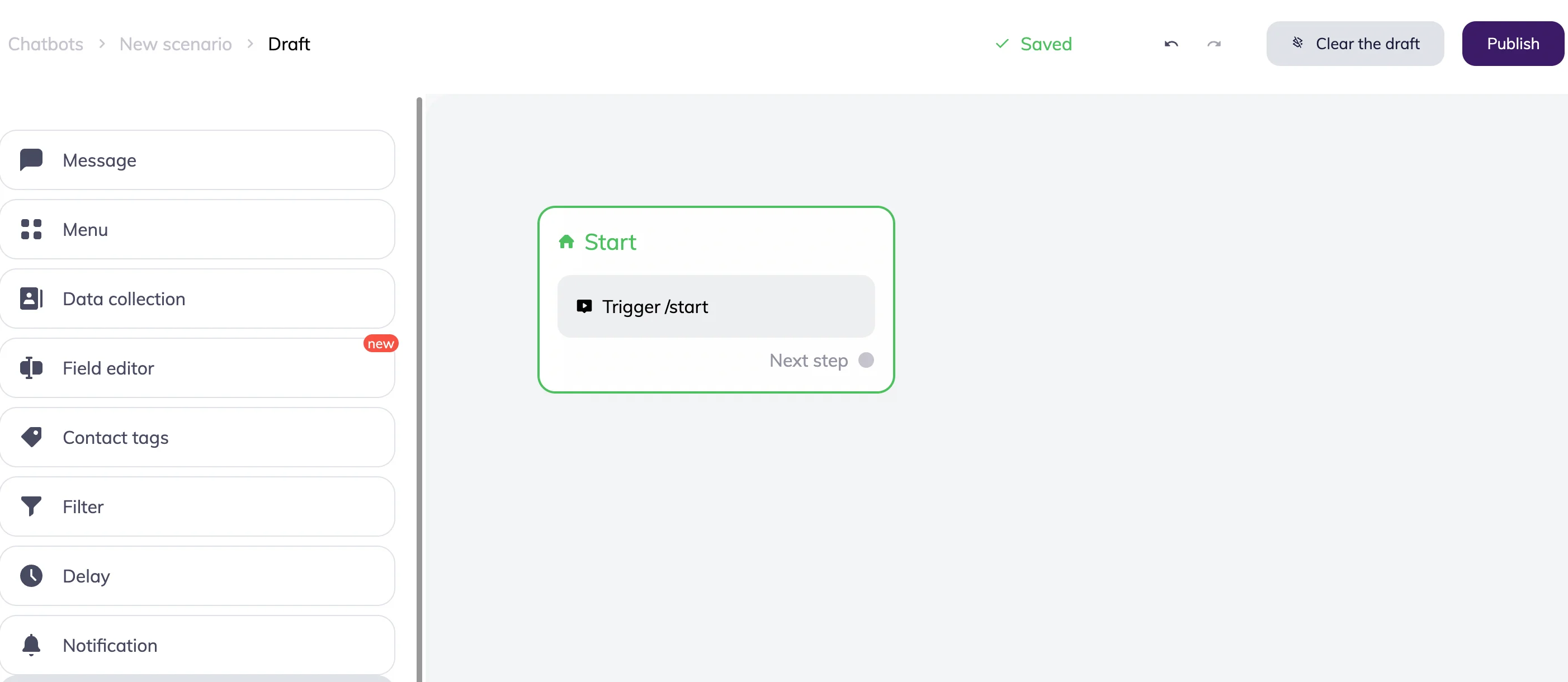 Sign in to Selzy → Chatbots. Open Selzy → Chatbots, click Create scenario.